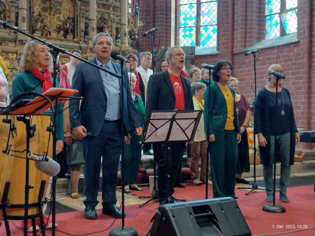 Auf dem Eberswalder Erntedankmarkt am 5. Oktober waren die Westend-Gospel-Singers in der Maria-Magdalenen-Kirche in Eberswalde auch in diesem Jahr wieder dabei. Zu einem Kleinen Konzert inmitten des Marktgeschehens sangen sie ihr Programm in der Maria-Magdalenen-Kirche. Unter dem Motto „Willkommen im Paradies“ erklang eine bunte Mischung von Titeln aus der Gospelliteratur. Diese reden von der herrlichen Schöpfung in die Gott uns stellt und die wir aufgerufen sind zu bewahren. So danken wir Gott für die Gaben, mit denen er uns seine Güte zeigt.