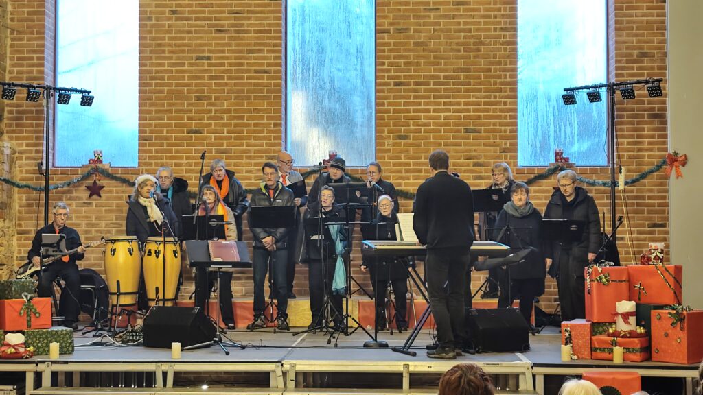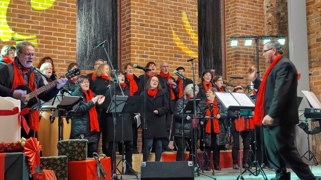 An diesem besonderen Ort treffen sich beide nun zum ersten Mal. Die Konzertgäste erlebten stimmungsvoll und bewegt die Weihnachtszeit mit der Geburt von Jesus Christus in der Krippe in Bethlehem. Sie hörten die Engel singen und begleiteten die Hirten und die Weisen gedanklich auf den Weg zur Krippe. Sie erlebten die weihnachtliche Freude, die die beiden Chöre, gern, jeweils auf ihre eigene Art schwungvoll und rhythmisch bewegt mit den Zuhörern teilten. Und sie hörten von der Friedensbotschaft, die die Weihnachtsgeschichte auch in unsere schwierige Zeit sendet.
